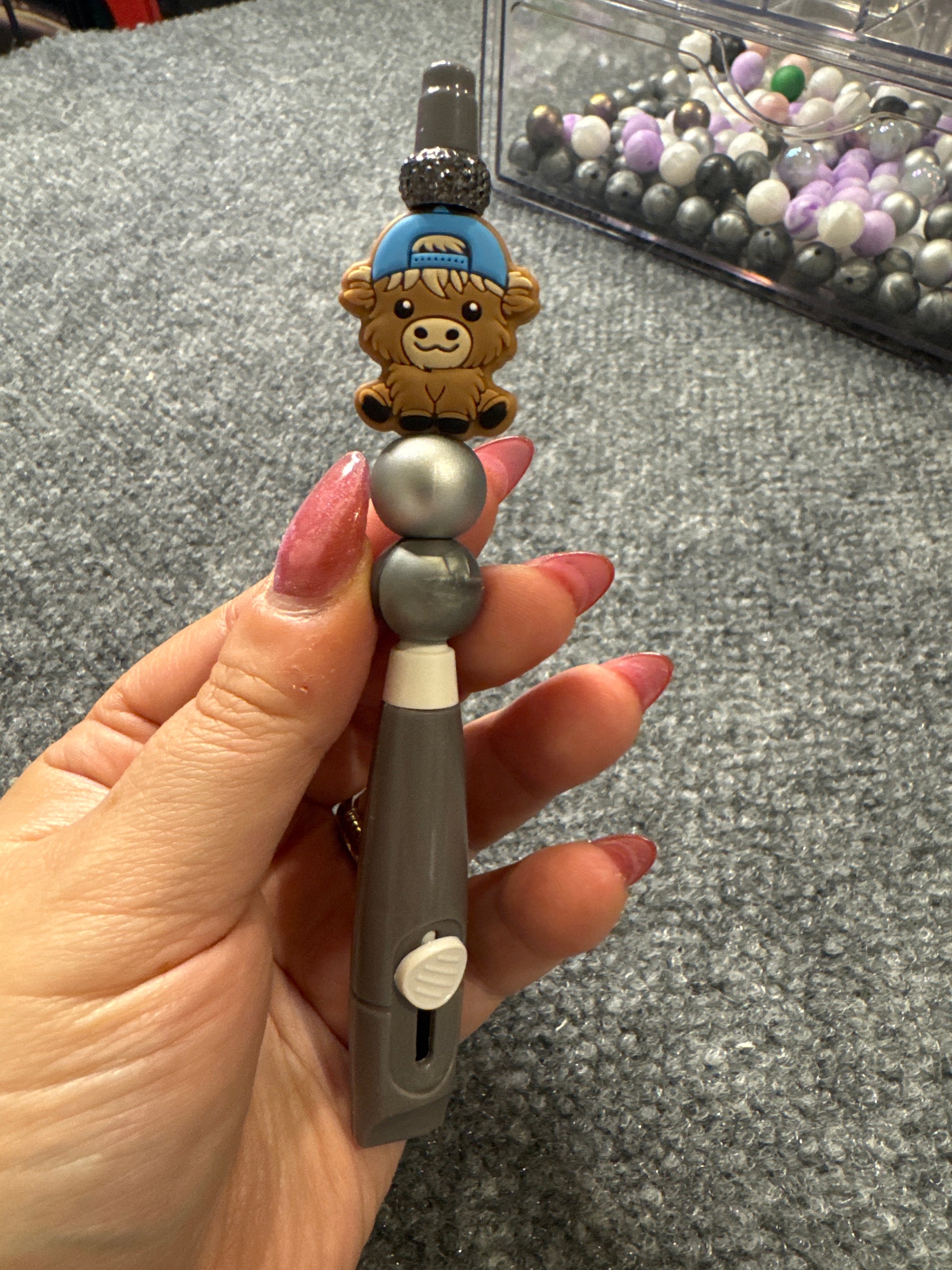 This is a customizable box cutter. The pictures in the listing is an example of a box cutter that you could make. Please be careful while using these as it has a sharp blade At the end at the end. There is a button that keeps the blade inside, but you push it out to use it. The blade automatically goes back in. Use caution.