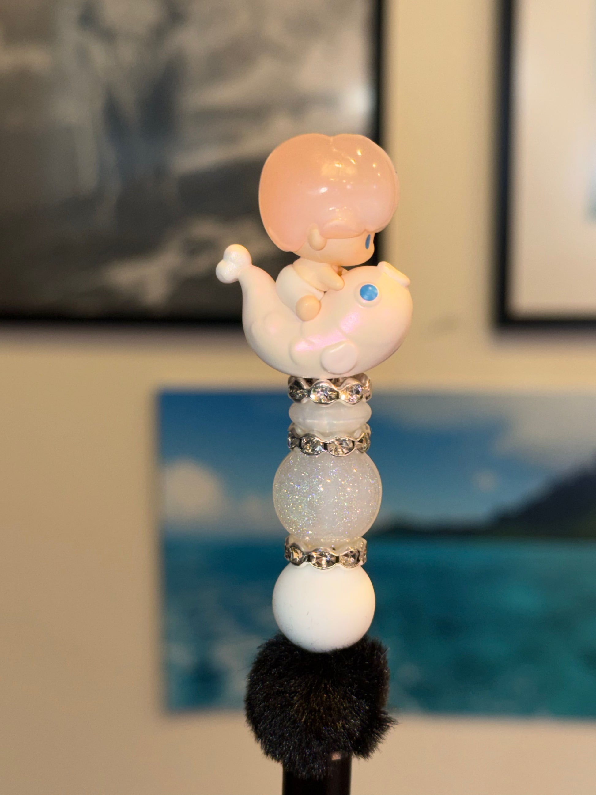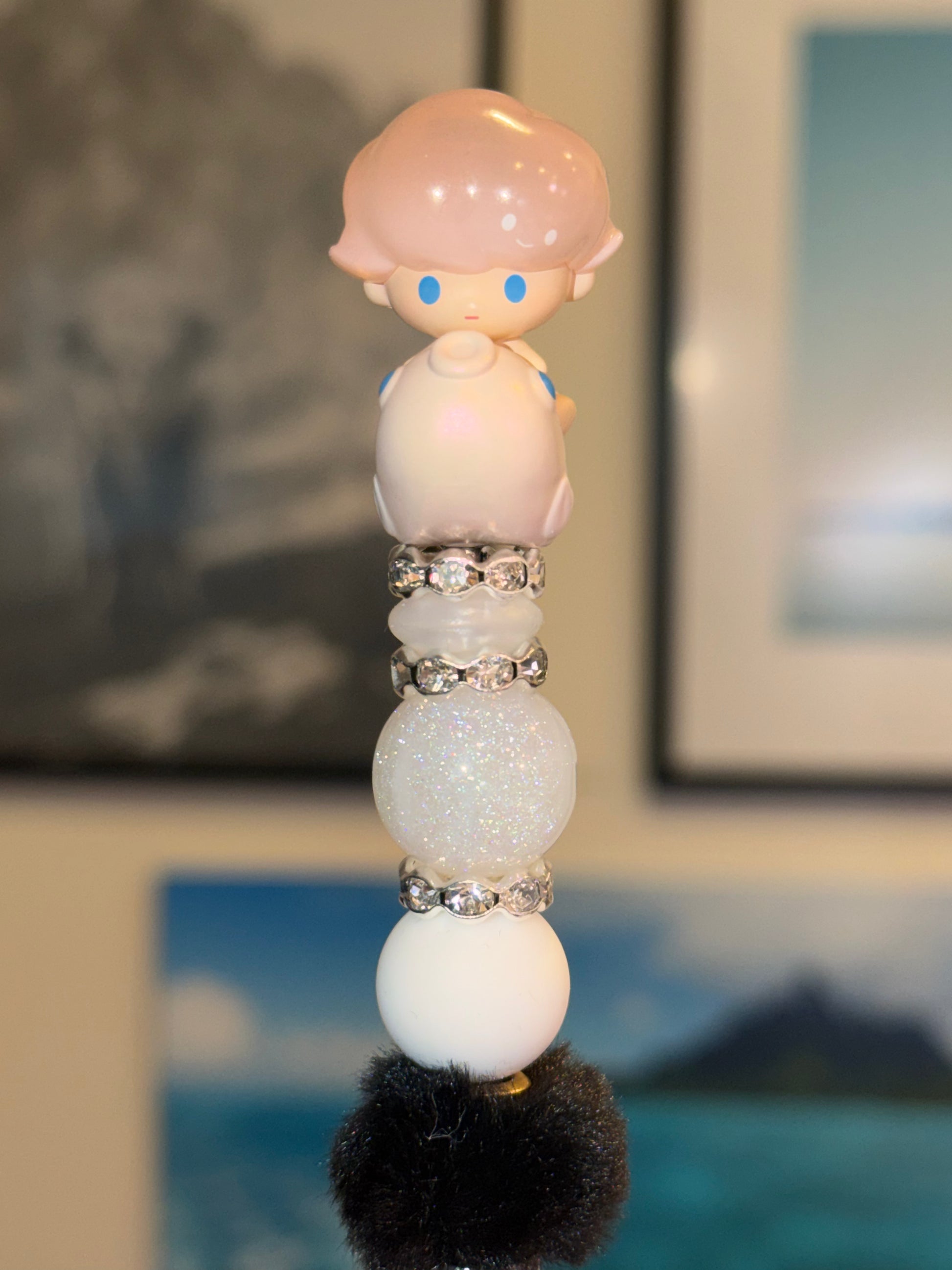 Materials: silicone beads, acrylic beads, glue, plastic, metal, rhinestones, black ink. Authentic pop beans from popmart.