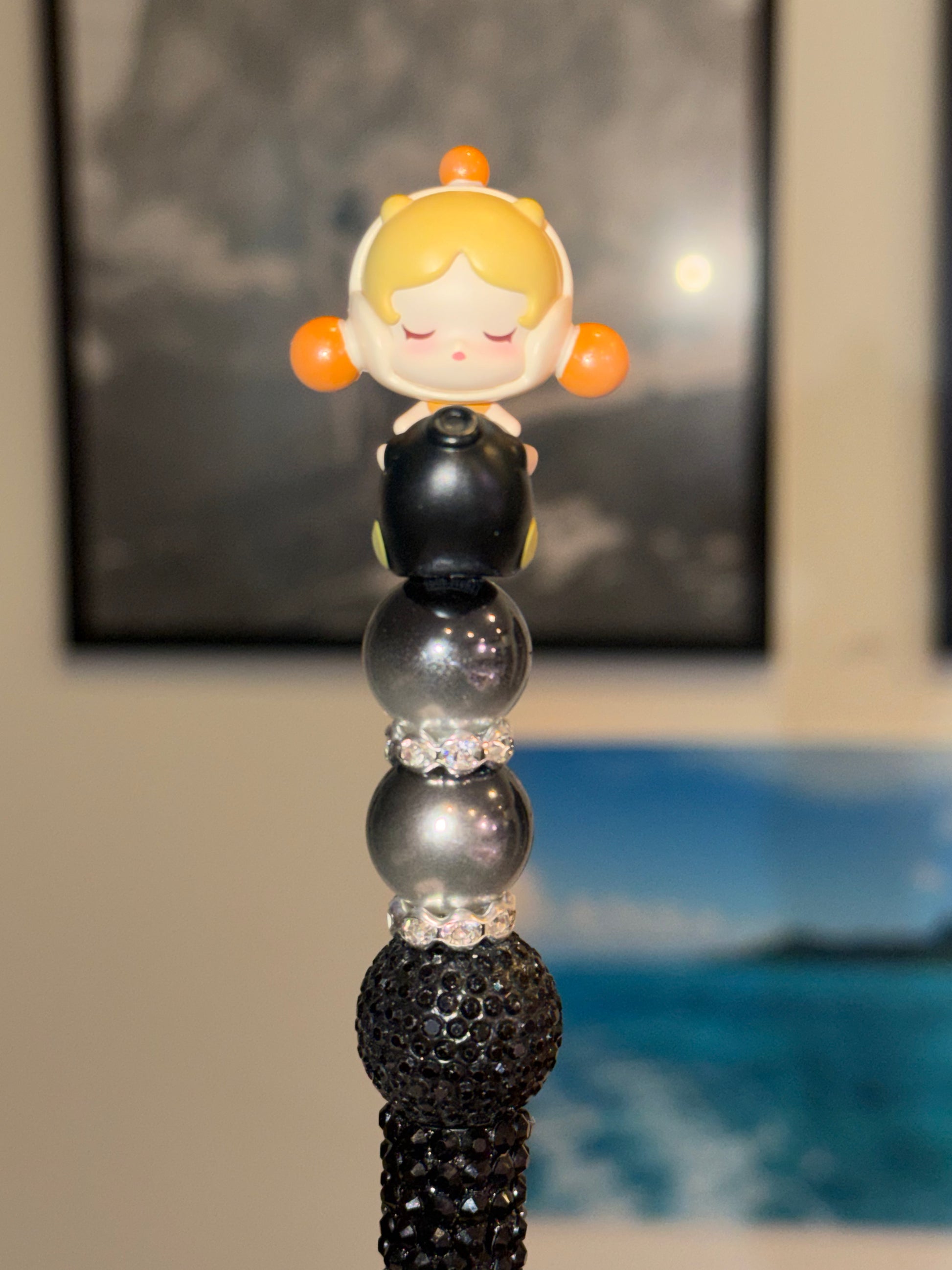 Materials: silicone beads, acrylic beads, glue, plastic, metal, rhinestones, black ink. Authentic pop beans from popmart.